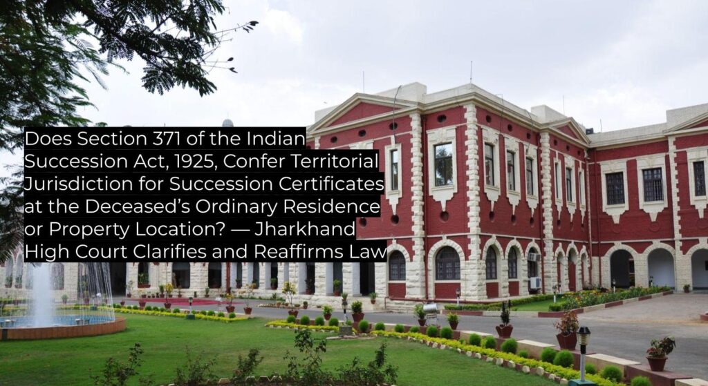 The High Court of Jharkhand reaffirms that, under Section 371 of the Indian Succession Act, 1925, jurisdiction to grant a succession certificate vests in the District Judge where the deceased ordinarily resided at the time of death, or where any part of the deceased’s property is located. The Court sets aside the earlier decision dismissing the application for lack of jurisdiction and remands the matter, thus upholding established precedent and providing binding authority for similar matters in Jharkhand.