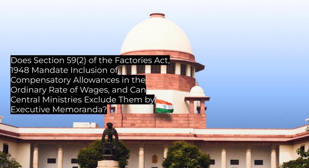 Employee unions of defence-production factories challenged the Union of India’s office memoranda excluding compensatory allowances—House Rent Allowance, Transport Allowance, Clothing & Washing Allowance, Small Family Allowance—from the “ordinary rate of wages” under Section 59(2) of the Factories Act, 1948. Their Original Applications before the Central Administrative Tribunal were dismissed. The Madras High Court allowed writ petitions, holding that all allowances payable to a worker form part of ordinary wages for overtime calculation. The Union of India appealed to the Supreme Court, which upheld the High Court’s interpretation and dismissed the appeal.