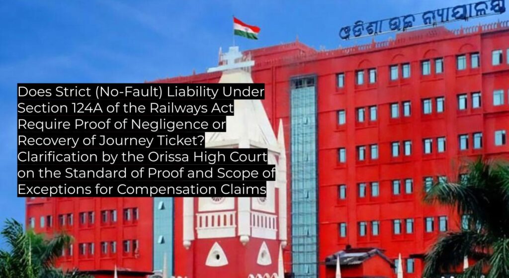 The Orissa High Court reaffirms that compensation for death or injury from an “untoward incident” under Section 124A of the Railways Act is governed by strict (no-fault) liability; proof of negligence is immaterial, and non-recovery of a ticket is not fatal if bona fide passengership can be circumstantially established. The Court applies Supreme Court precedent and narrows the application of statutory exceptions, strengthening binding authority for claimants and practitioners in railway accident claims.