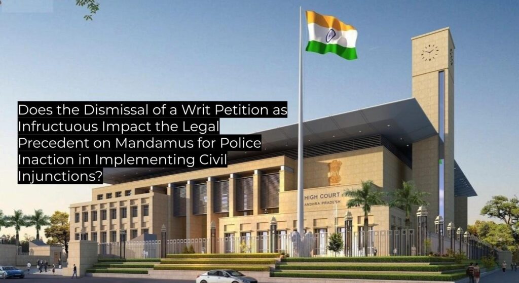 The High Court of Andhra Pradesh dismissed a writ petition as infructuous without adjudicating the substantive legal issue of mandamus against police inaction in implementing a civil court’s injunction. This order neither creates nor clarifies binding precedent, and the writ’s dismissal does not alter the existing legal position on police aid or enforcement of civil decrees.