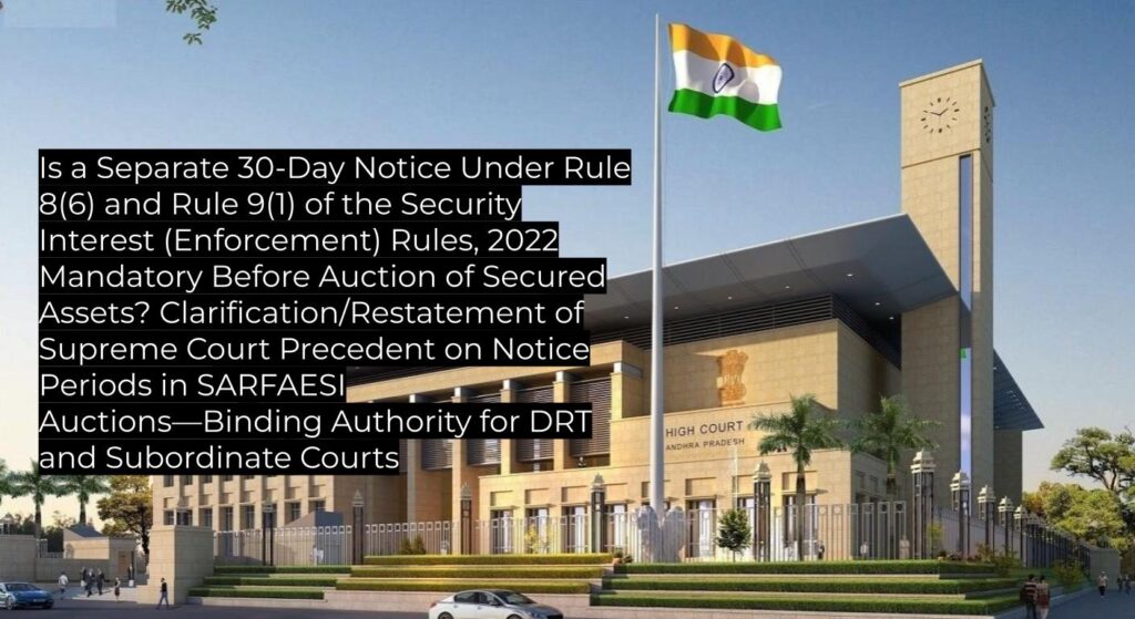 The Andhra Pradesh High Court reaffirms, following Supreme Court law, that a 30-day gap between Rule 8(6) and Rule 9(1) notices is not mandatory, and non-compliance does not vitiate SARFAESI auction proceedings. This decision sets aside contrary DRT stays and directs adherence to Supreme Court interpretation, serving as binding precedent for subordinate courts and tribunals in SARFAESI matters.