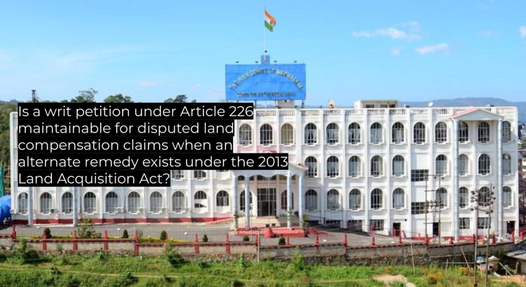 High Court of Meghalaya dismisses challenge to compensation entitlement, affirming that Article 226 writs cannot supplant statutory remedies under the Right to Fair Compensation and Transparency in Land Acquisition, Rehabilitation and Resettlement Act 2013; upholding existing precedent and binding on subordinate courts in land acquisition disputes.