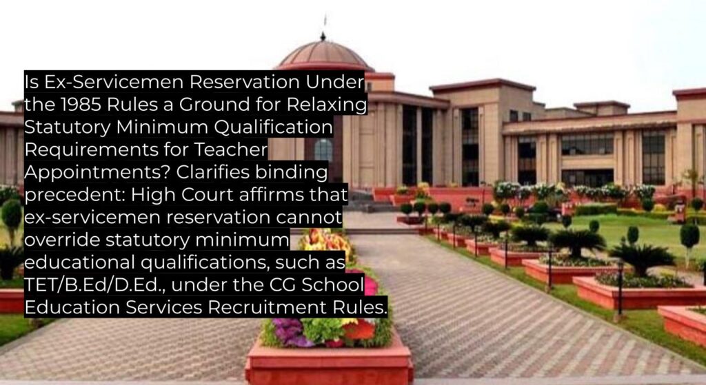 The High Court holds that ex-servicemen cannot bypass the minimum qualification requirements prescribed by the 2009 Recruitment Rules, reaffirming that eligibility standards set as per NCTE guidelines must be met regardless of reservation policies. This judgment upholds existing precedent, has binding effect on subordinate courts in Chhattisgarh, and is directly relevant to education sector recruitment.
