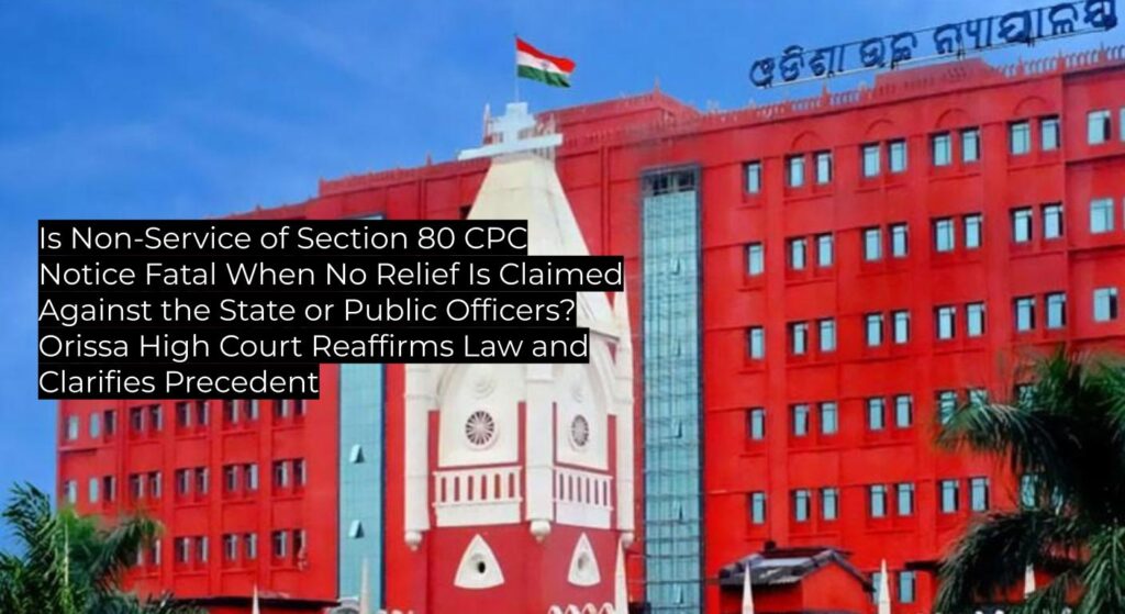 Orissa High Court holds that Section 80 CPC notice is not mandatory where no independent relief is claimed against the State or public officers, even if they are impleaded as parties. The Court affirms established precedent and highlights that the main relief of declaration of title determines the procedural requirement. This ruling serves as binding authority for subordinate courts in Odisha and clarifies the interplay between substantive relief and procedural compliance in civil suits involving government entities.