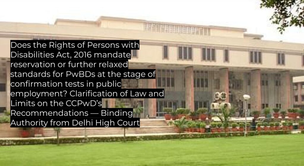 The Delhi High Court has clarified that while the RPwD Act mandates reservation for Persons with Benchmark Disabilities (PwBDs) at the initial recruitment stage, there is no statutory or constitutional requirement for reservation at the stage of confirmation tests. However, “relaxed standards” and reasonable accommodation must be applied for the PwBD category in such internal assessments. The Court reaffirms Supreme Court and Delhi High Court precedent, providing clear guidance for future employment and public law disputes involving PwBDs.