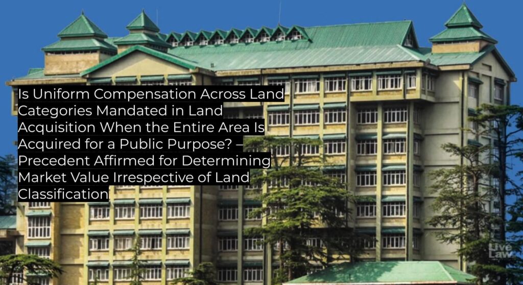 The High Court of Himachal Pradesh reaffirmed that when land is acquired as a single unit for public purposes such as road construction, compensation must be determined at a uniform rate, regardless of the land’s earlier classification or nature. This judgment upholds prior Supreme Court and High Court precedent and will serve as binding authority for future land acquisition compensation cases within Himachal Pradesh, particularly regarding infrastructure projects.