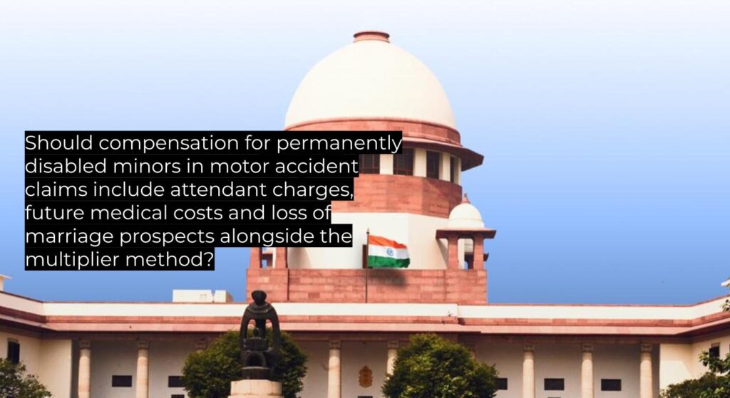 | Questions of Law | Should compensation for permanently disabled minors under Section 166 MVA include multiplier-based future earnings plus specific heads such as attendant charges, loss of marriage prospects, special diet and transport, pain and suffering and future medical expenses? |