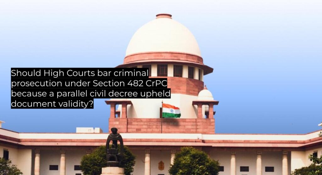 | Questions of Law | Whether Section 482 CrPC powers may be used to quash criminal proceedings simply because civil proceedings on same subject are pending or concluded |