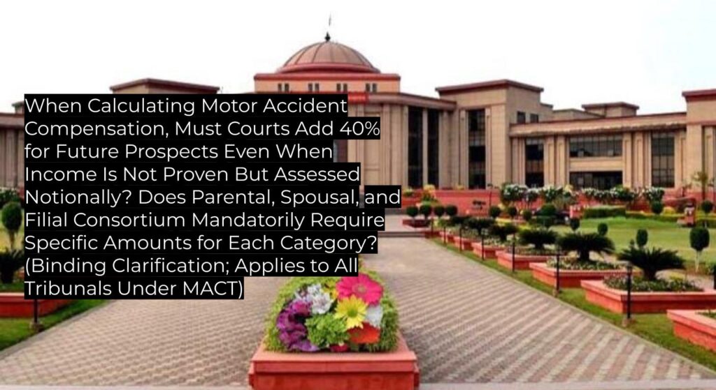 The Chhattisgarh High Court, relying on Supreme Court precedent (Pranay Sethi, Magma General, Satinder Kaur), reaffirmed that for deceased persons under 40 years with no proven income, 40% must be added towards future prospects over the notional income, and multiple consortiums (spousal, parental, filial) are awardable to eligible claimants. This approach is compulsory unless superseded by higher court or subsequent legislation; the ruling modifies prior practices where lesser heads or quantum were used, and serves as binding authority for Motor Accident Claims Tribunals in Chhattisgarh.