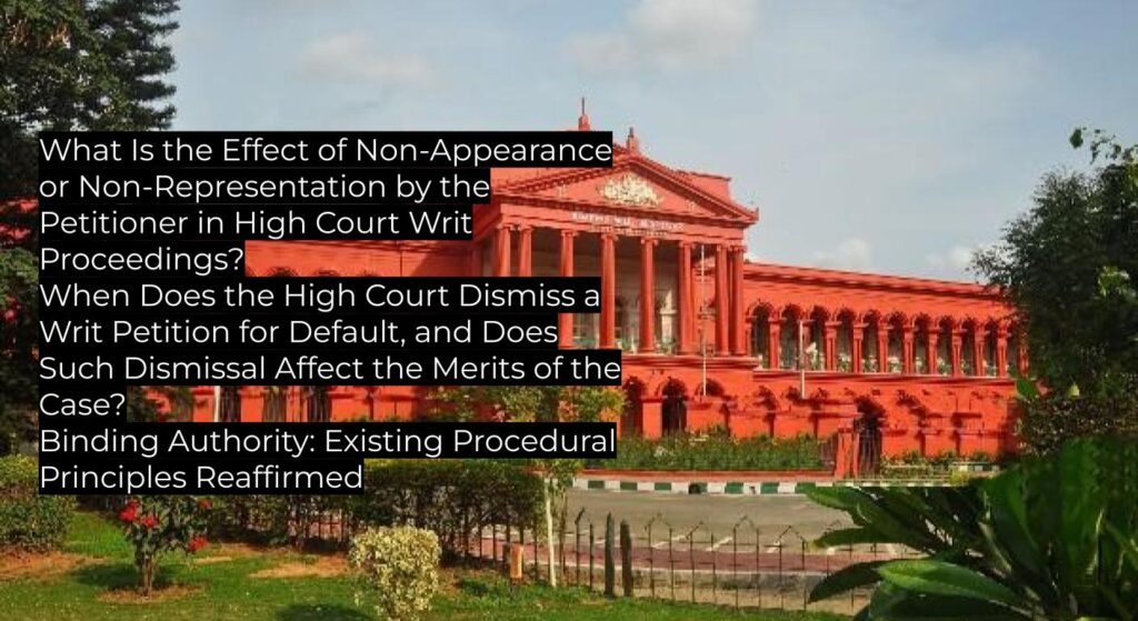 A single judge of the Karnataka High Court reaffirmed that where counsel is unable to obtain instructions or ensure the petitioner’s presence, and reasonable opportunity has been given, the Court has no alternative but to dismiss the petition. This order upholds existing procedural precedent regarding the duties of counsel and litigants in writ proceedings, with binding value for future cases concerning dismissal for default within the Karnataka High Court’s jurisdiction.