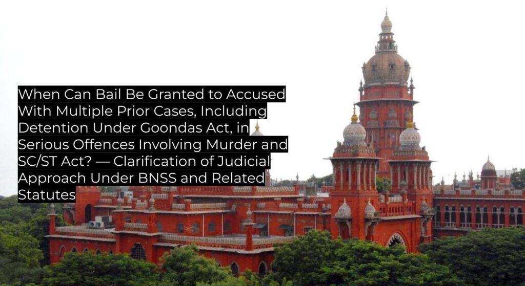 Madras High Court clarifies that pendency of prior cases and previous preventive detention under the Goondas Act are relevant but not absolute bars to bail under Section 483 BNSS, especially when investigation is near completion and detention orders are revoked; affirms established principles, with case-specific nuanced application to grave offences involving murder and SC/ST (POA) Act. Dismissal or grant of bail must account for seriousness and nature of pending cases, and judicial custody duration, and is binding on subordinate courts within the jurisdiction.