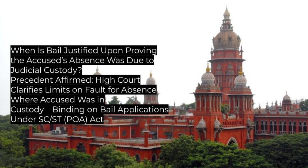 The Madras High Court reaffirmed that an accused’s absence from trial cannot be held against them when they were in judicial custody at the relevant time. This decision, delivered under Section 14A(2) of the SC/ST (POA) Act, upholds procedural fairness in bail considerations, clarifies trial court obligations, and is binding on all lower courts within its jurisdiction.