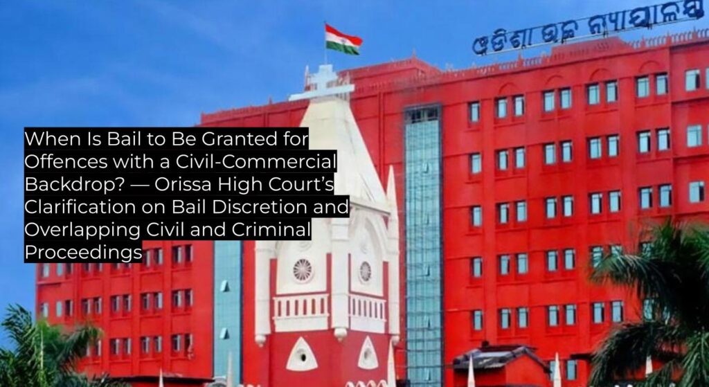 Court endorses that the pendency of related civil suits and completion of investigation weigh in favour of granting bail for offences under BNS involving fraud and forgery between individuals, unless specific flight risk or evidence tampering concerns arise. The decision upholds the Supreme Court’s precedents, clarifying that denial of bail is the exception, not the norm, in such cases, and affirms the triple-test as a determinative standard. Binding authority for subordinate courts in Odisha.