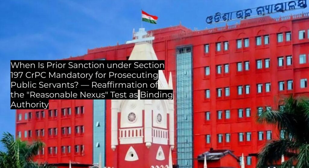 The Orissa High Court reaffirms Supreme Court precedents clarifying that courts must insist on prior sanction under Section 197 CrPC where the alleged acts of a public servant have a reasonable connection to official duties; this ruling upholds existing law and serves as binding precedent for subordinate courts, with direct practical impact on complaints against public officials in the discharge of their functions.